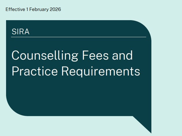 SIRA has released the new NSW 2026 fees order and session rates for NSW WorkCover Counselling clients. Initial consultation COU002 and COU302 rates are now $17.60/5 minutes (maximum 60 minutes) and Subsequent COU003 and COU303 consultation sessions are now $15.80/5 minutes (maximum 60 minutes).